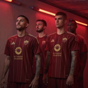 UN MAILLOT DOMICILE INSPIRÉ DE L’HISTOIRE DE L’AS ROMA ET FABRIQUÉ EN MATIÈRES RECYCLÉES.